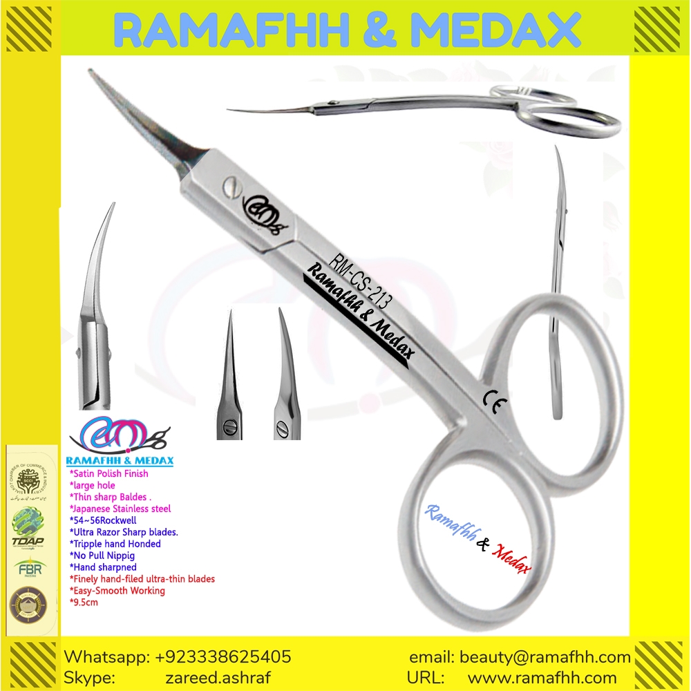 Fine tip Cuticle scissors.               9CM  Satin Polish FINISH. Large finger holes for extra comfort while cutting. Curved sharp and pointed blade, adjustable-screw, Extra delicate for precision cutting of cuticles.  edges are sharpened by hand, and perfectly aligned. The tips are very sharp,                                                  Stainless steel Forged, Rock well~ 52-56                      Finishes:  Mirror Shiny POLISH, Super Matt, Satin, Gold, Nickel Chrome & Silver Plating and in Natural colors