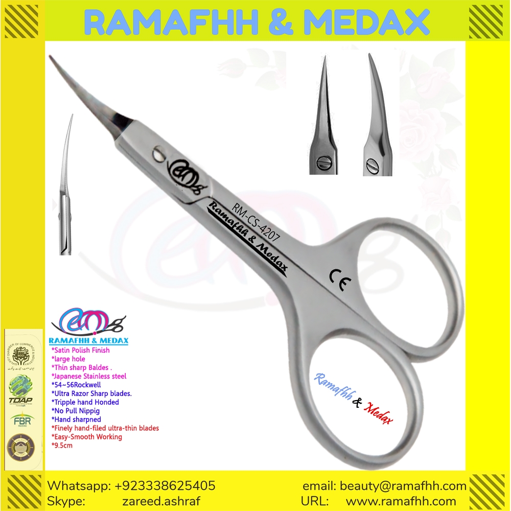 Fine tip Cuticle scissors. 9CM Satin Polish FINISH. Large finger holes for extra comfort while cutting. Curved sharp and pointed blade, adjustable-screw, Extra delicate for precision cutting of cuticles. edges are sharpened by hand, and perfectly aligned. The tips are very sharp, Stainless steel Forged, Rock well~ 52-56 Finishes: Mirror Shiny POLISH, Super Matt, Satin, Gold, Nickel Chrome & Silver Plating and in Natural colors